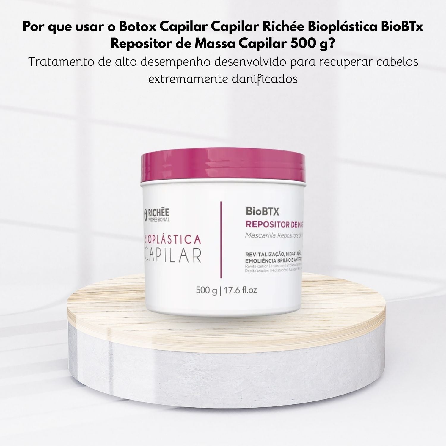 O Botox Capilar Capilar Richée Bioplástica BioBTX Máscara Repositora 500 g é um produto para Cabelos desenvolvido dentro da proposta da linha Bioplástica, pensado para entregar cuidado e sensorial de uso no dia a dia.