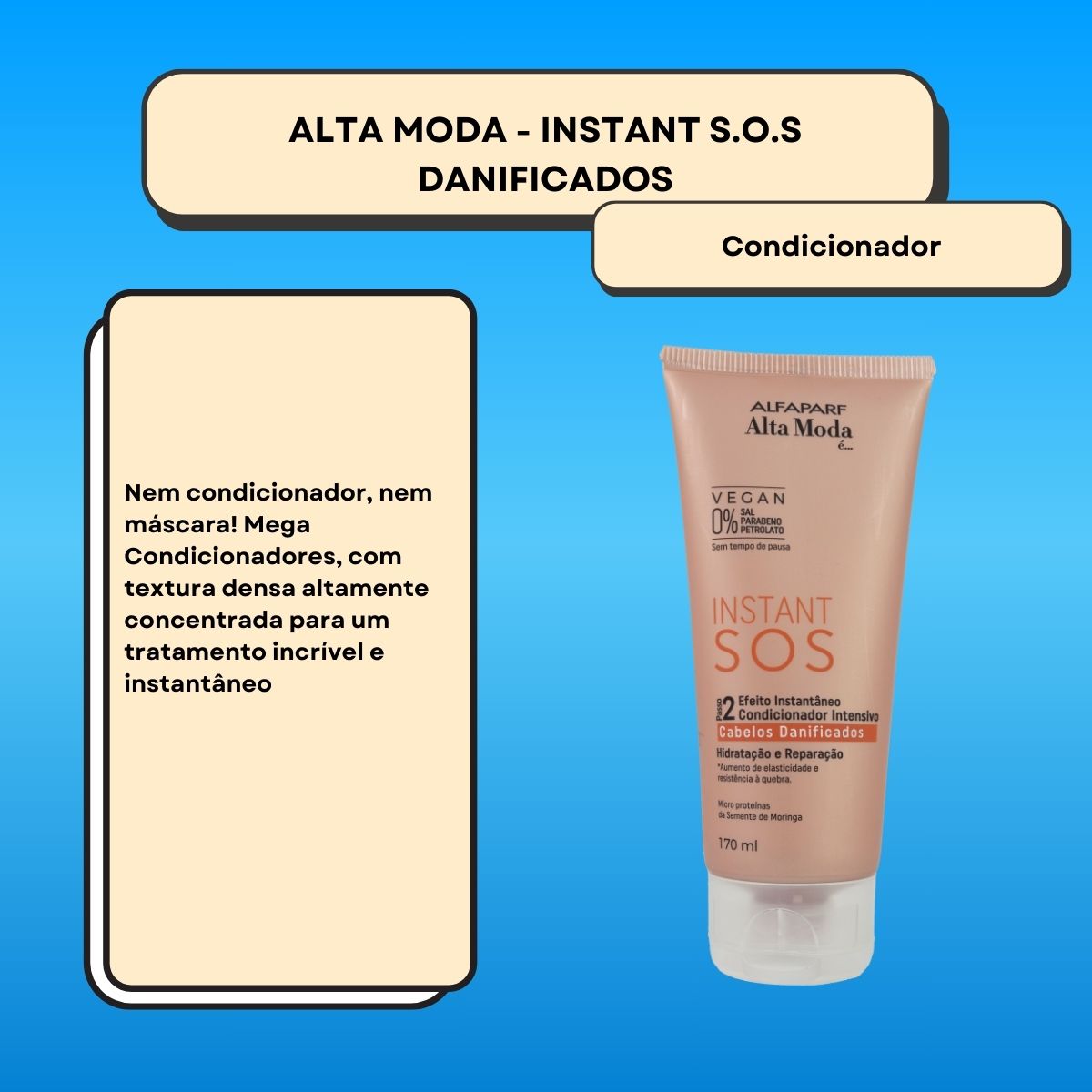 O Condicionador Alfaparf Alta Moda SOS Danificados 170 ml foi desenvolvido para oferecer tratamento profissional conforme a proposta da linha Alfaparf, promovendo melhora visível na qualidade da fibra capilar e desempenho cosmético avançado.