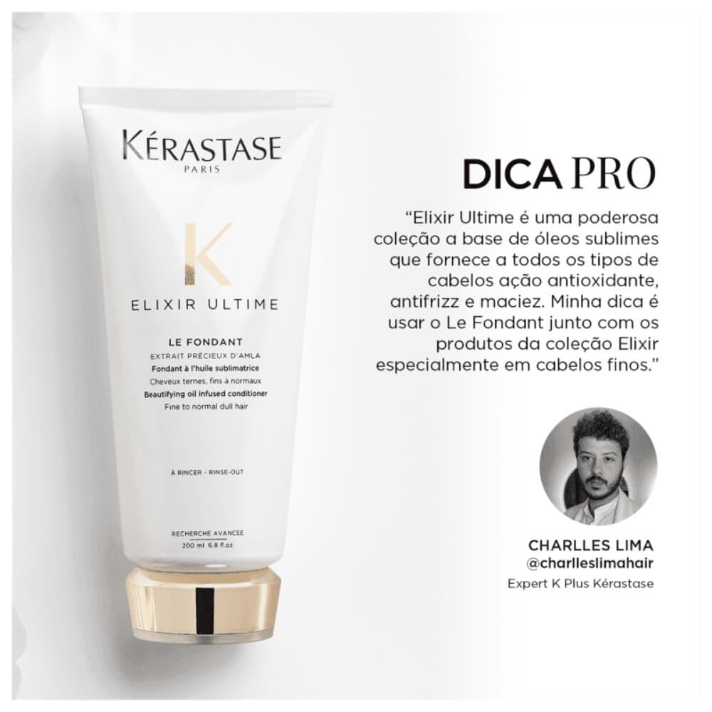 Condicionador para cabelos sem brilho. Kérastase Elixir Ultime Le Fondant promove uma nutrição profunda que suaviza o fio e traz luminosidade e disciplina. Sua fórmula desembaraça e controla o frizz até em condições extremas de ambiente.