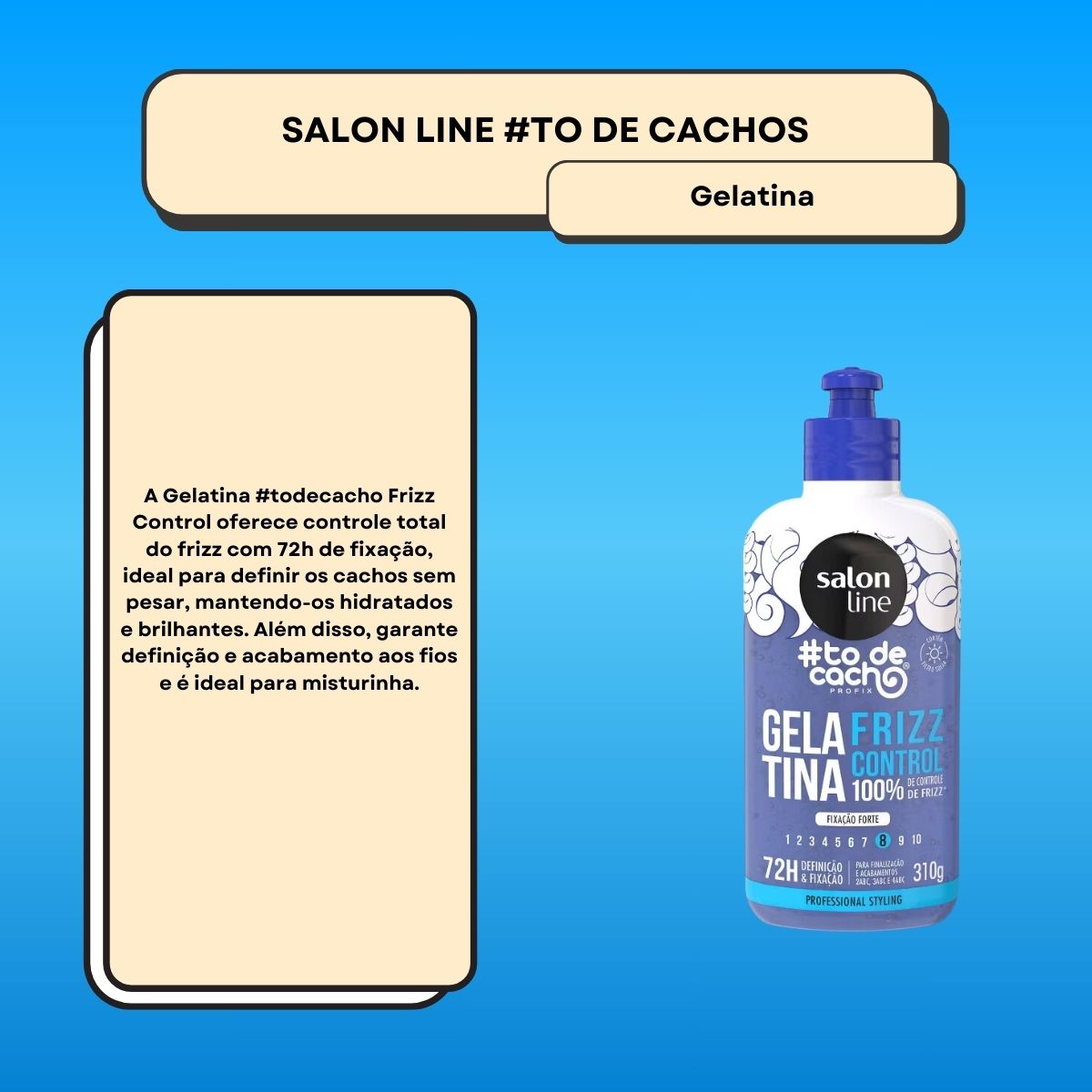 Gelatina Salon Line #todecacho Frizz Control 310 g é um cuidado para cabelos pensado para entregar desempenho na rotina, com foco no que a categoria promete (Finalizador).