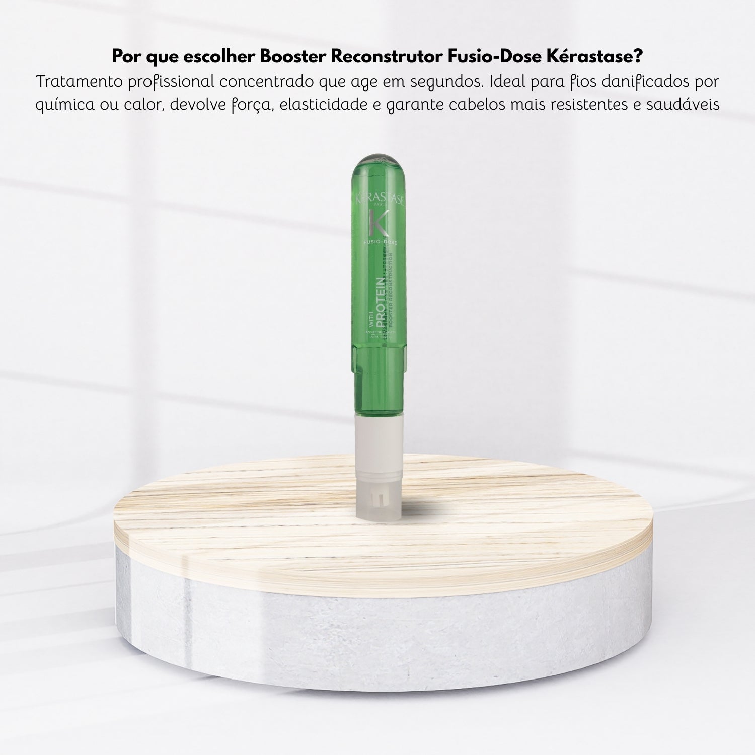Lave os cabelos com o Shampoo Kérastase indicado para seu tipo e retire o excesso de água. Retire a tampa do frasco da ampola (concentrado) e encaixe o booster (tampa) no corpo da ampola e rosqueie no sentido horário até ouvir um clique para liberar o fluído da cápsula.