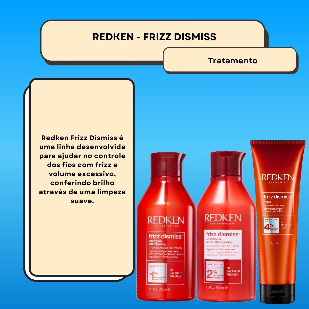 O Kit Redken Frizz Dismiss Cuidados Diários (3 Produtos) é um produto para Cabelos desenvolvido dentro da proposta da linha Frizz Dismiss, focado em desempenho profissional e tratamento direcionado conforme a necessidade dos fios.