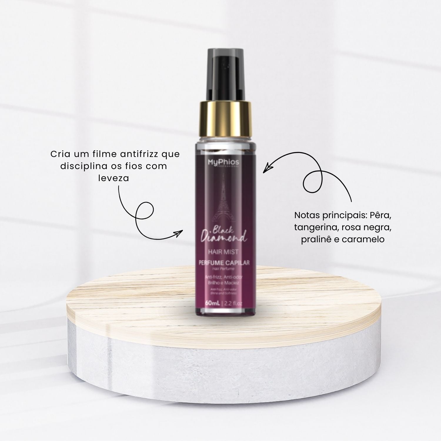 Perfume capilar BLACK DIAMOND Hair Mist é perfeito para quem busca um cabelo perfumado, leve e protegido diariamente. Ideal para todos os tipos de cabelo, promove maciez e frescor duradouro, mantendo a elegância da fragrância em cada fio. Palavras-chave integradas: perfume capilar, hair mist, MyPhios Professional.