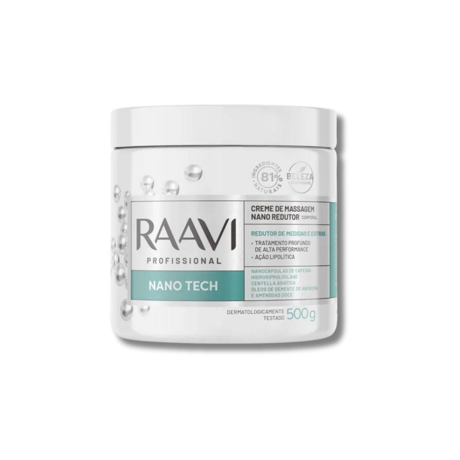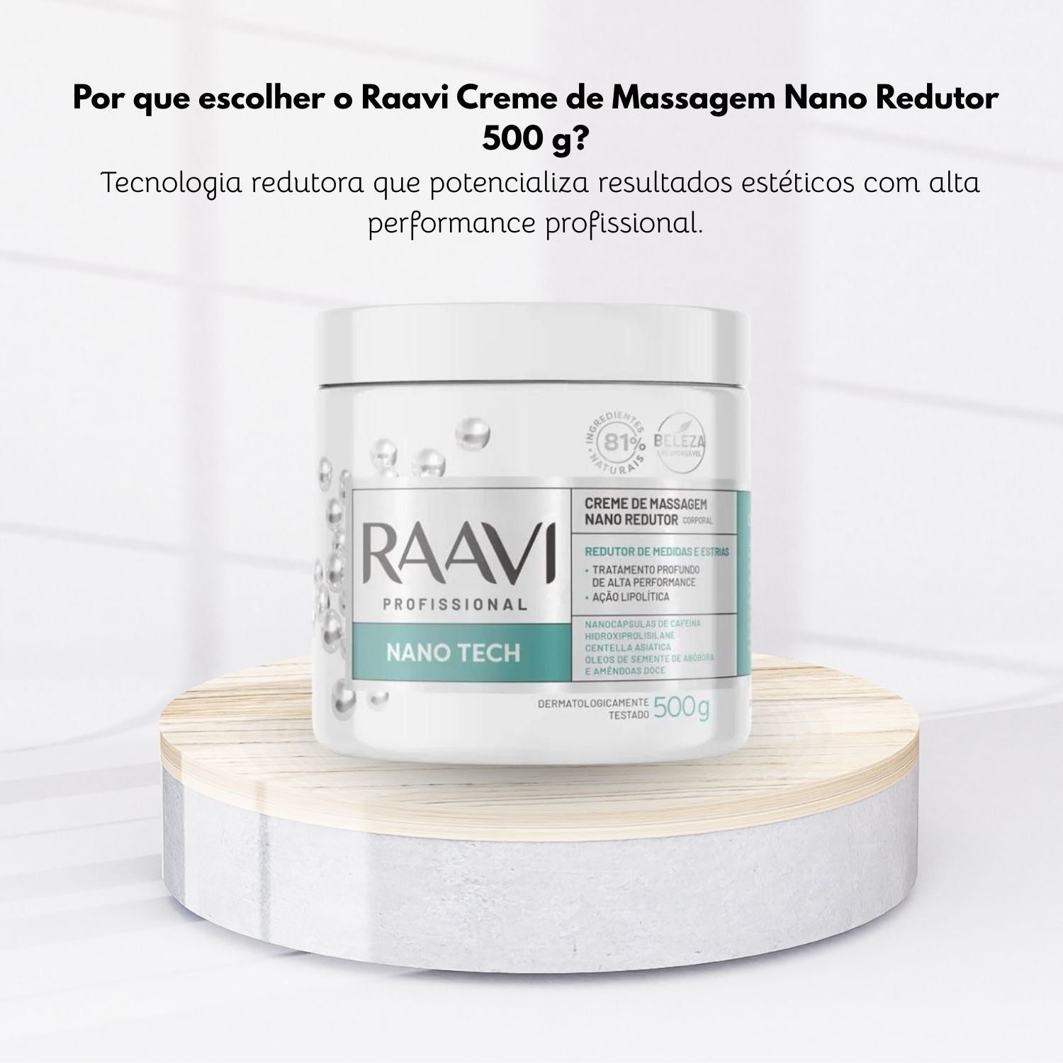 Raavi Creme de Massagem Nano Redutor 500 g é um produto de skincare desenvolvido para promover massagem / modelagem corporal, ajudando a melhorar a aparência e o conforto da pele.