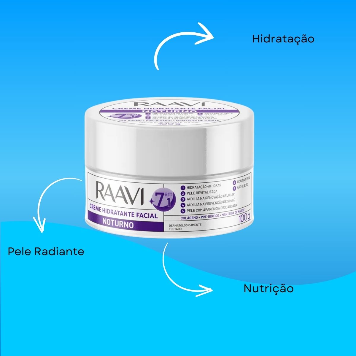 Raavi Creme Hidratante Facial Noturno 100 g é um produto de skincare desenvolvido para promover hidratação, ajudando a melhorar a aparência e o conforto da pele.