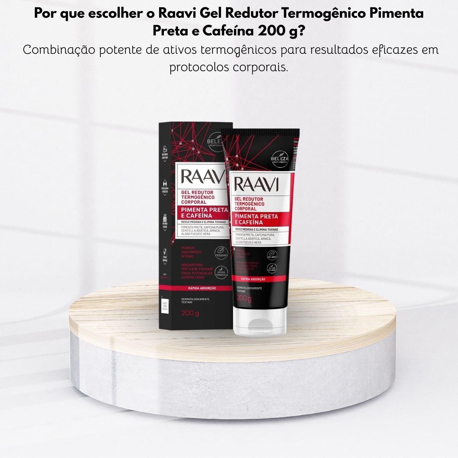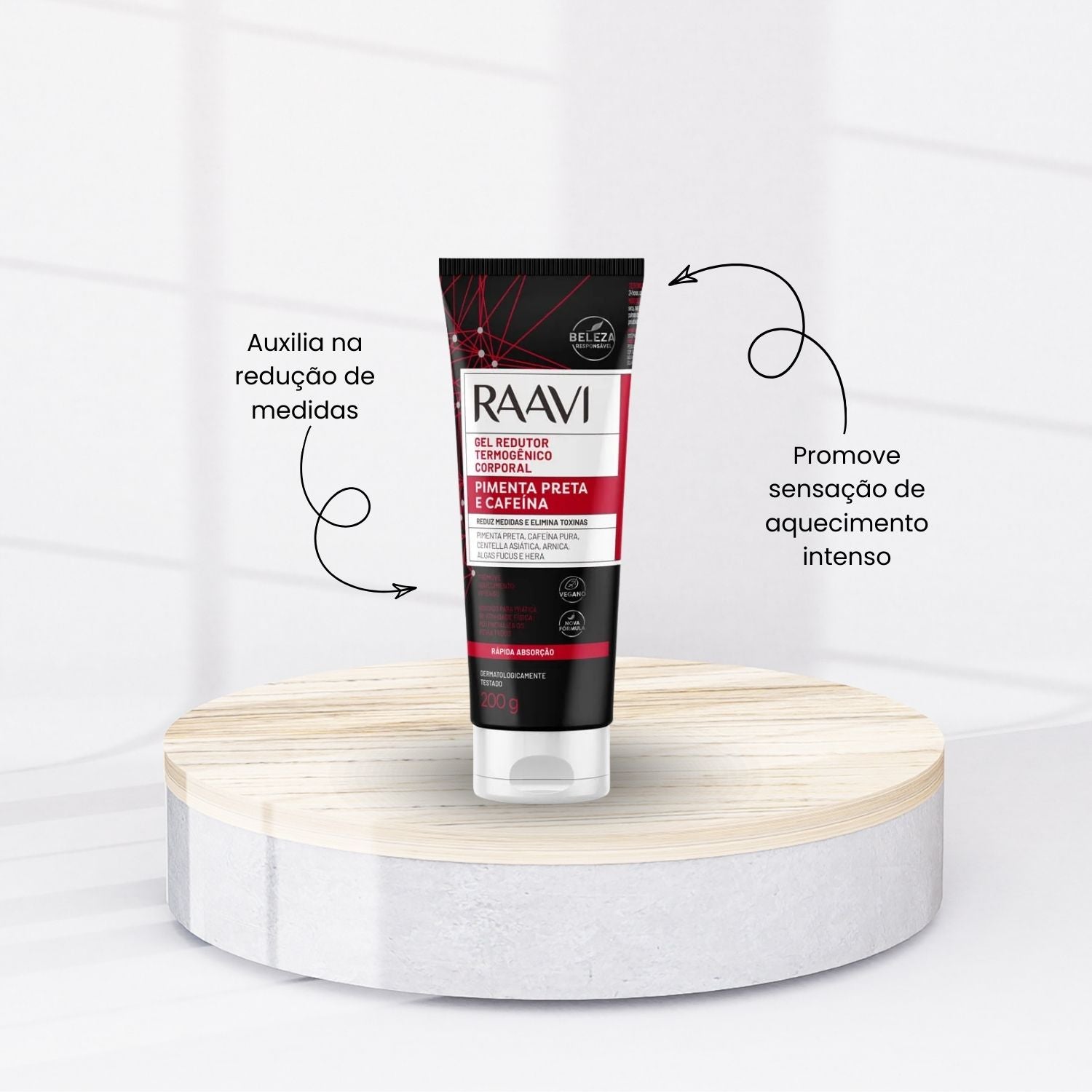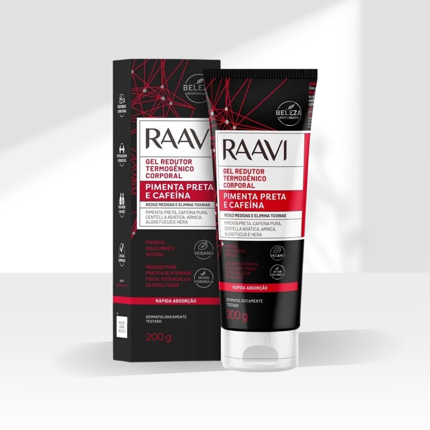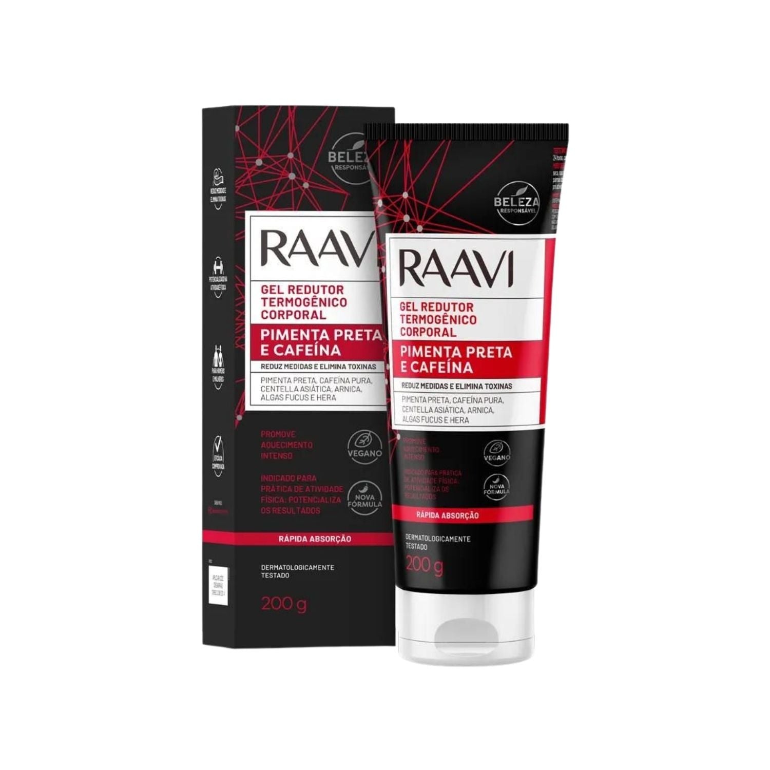 Raavi Gel Redutor Termogênico Pimenta Preta e Cafeína 200 g é um produto de skincare desenvolvido para promover massagem / modelagem corporal, ajudando a melhorar a aparência e o conforto da pele.