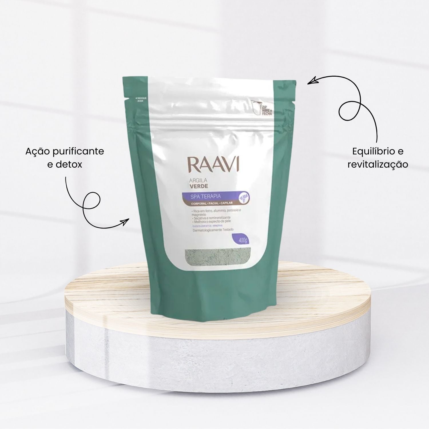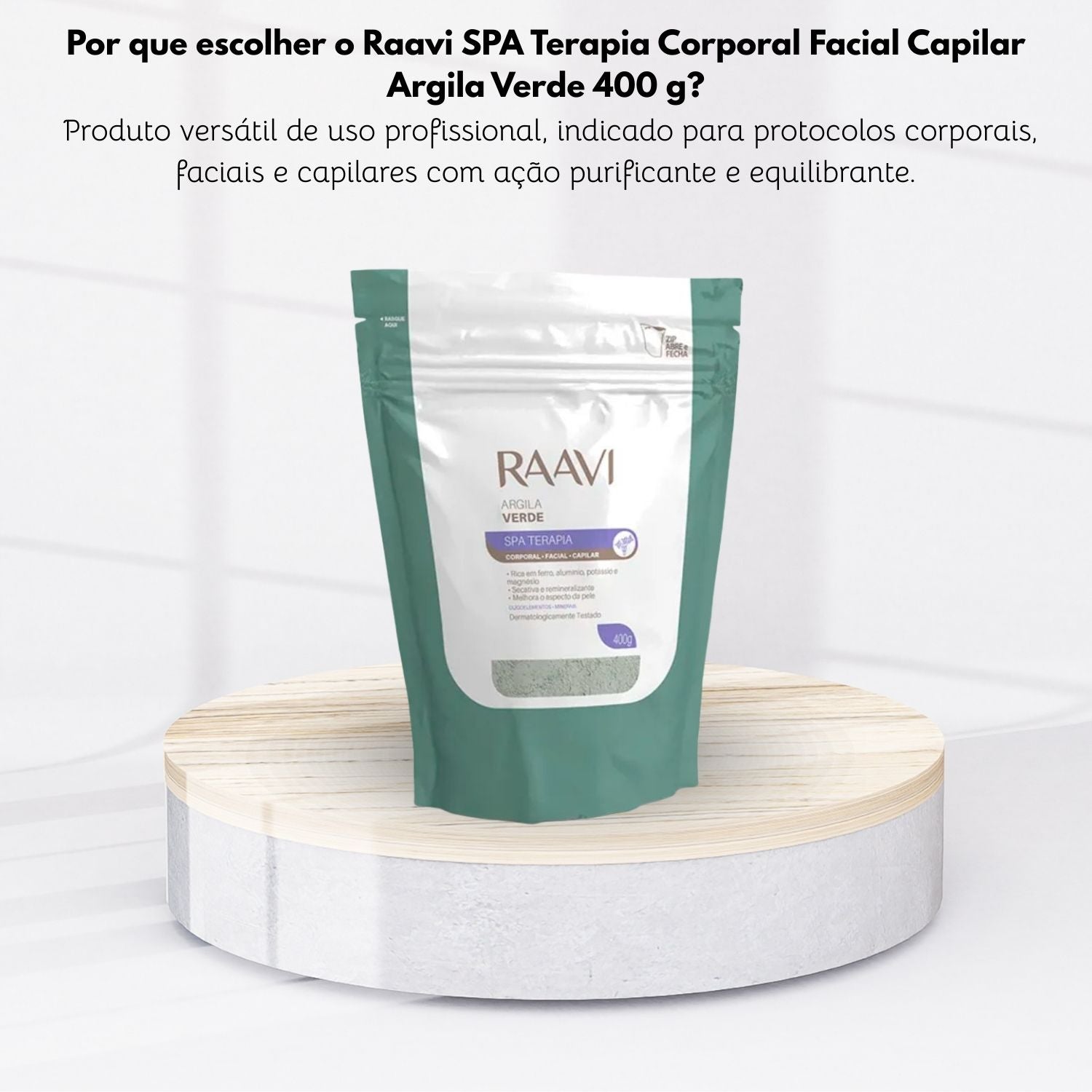 Raavi SPA Terapia Corporal Facial Capilar Argila Verde 400 g é um produto de skincare desenvolvido para promover detox / purificação, ajudando a melhorar a aparência e o conforto da pele.
