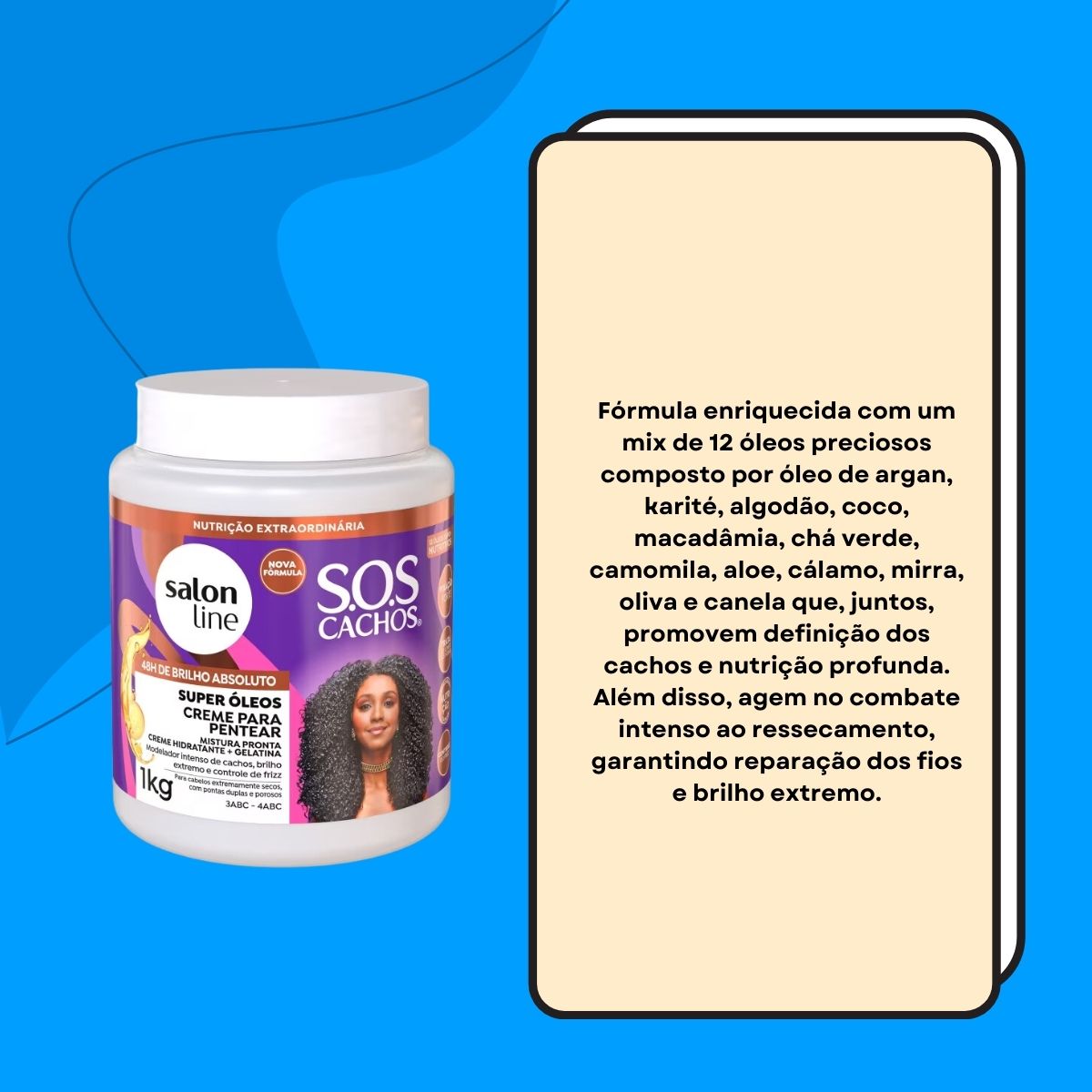 - Blend de Óleos: combinação nutritiva que aumenta a emoliência, ajuda no frizz e melhora a definição.