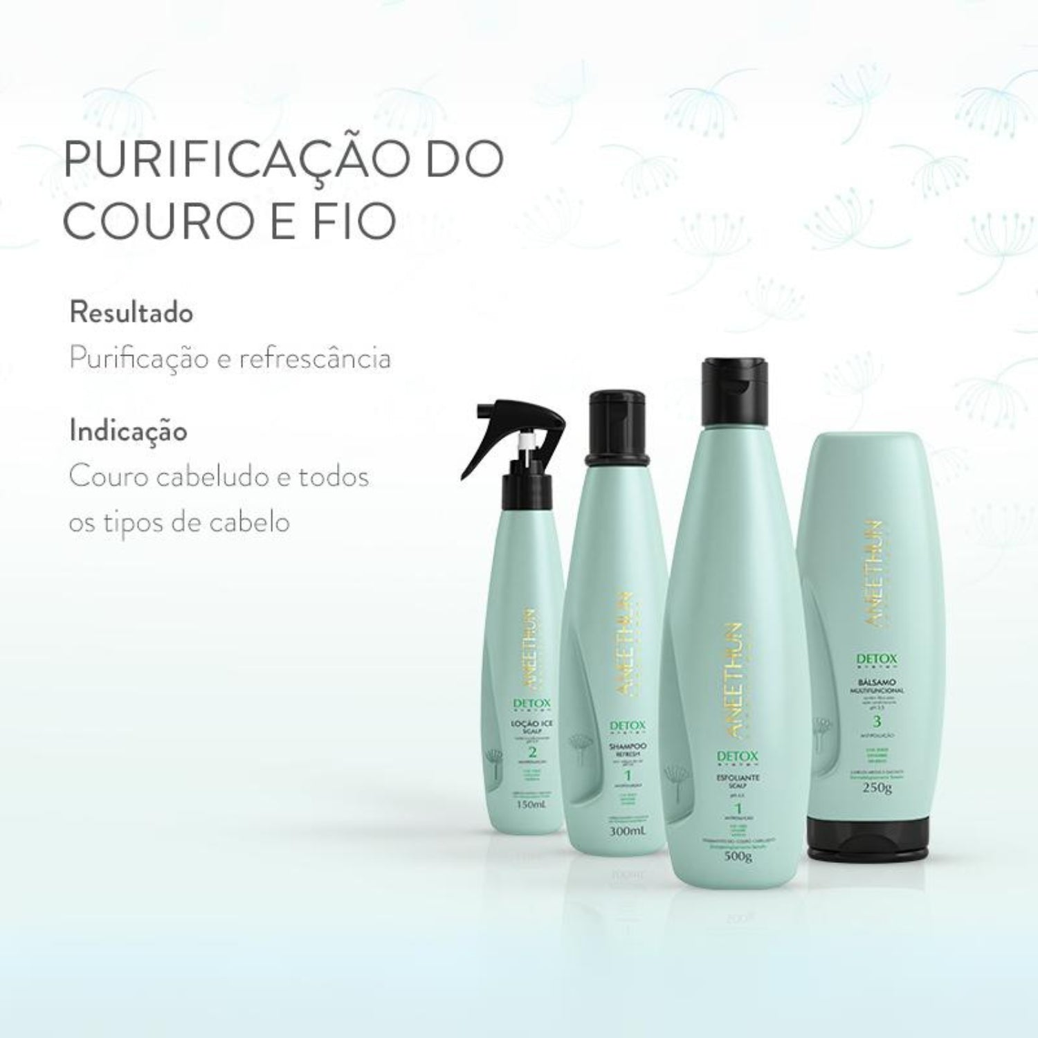 A Linha Detox System é indicada para equilibrar a saúde do couro cabeludo, nutrir e purificar os fios. Possui antirradicais livres, ação adstringente, antipoluição e antisséptica, que regula o funcionamento do bulbo e controla a oleosidade excessiva, promovendo uma agradável sensação de frescor e leveza. Aneethun Detox Shampoo Refresh é revigorante para todos os tipos de cabelos. Sua fórmula desintoxicante possui ação antipoluição, proporciona a limpeza energizante e eficiente do couro cabeludo e dos cabelos.