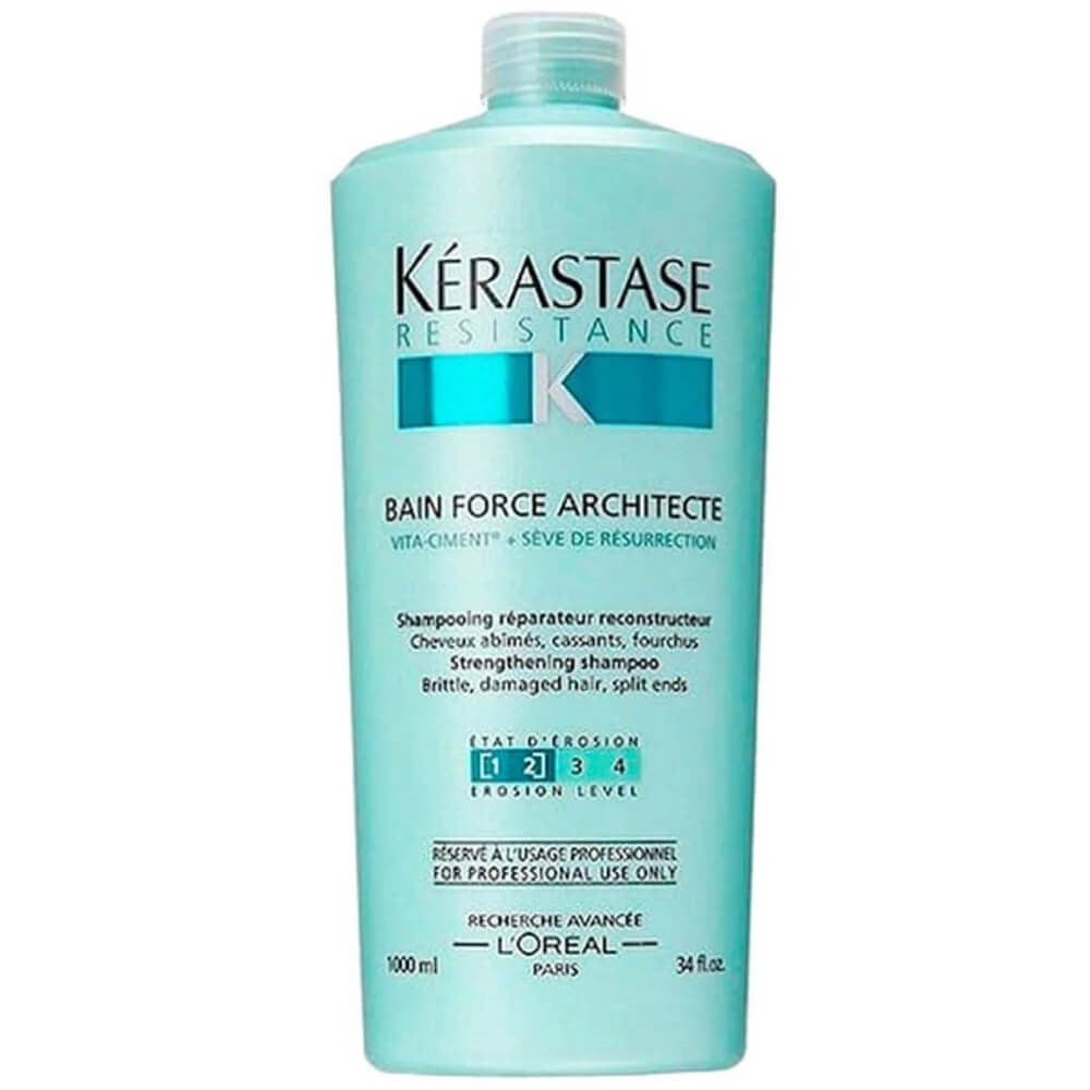 Kerastase Resistance Bain Force Architecte Shampooé um shampoo dedicado a reconstrução dos cabelos danificados e cicatrização da fibra capilar. É indicado para tratamento de cabelos danificados ou com ponta dupla, para cabelos que sofrem o uso frequente de secadores e chapinhas e ou que sofreram processos químicos.