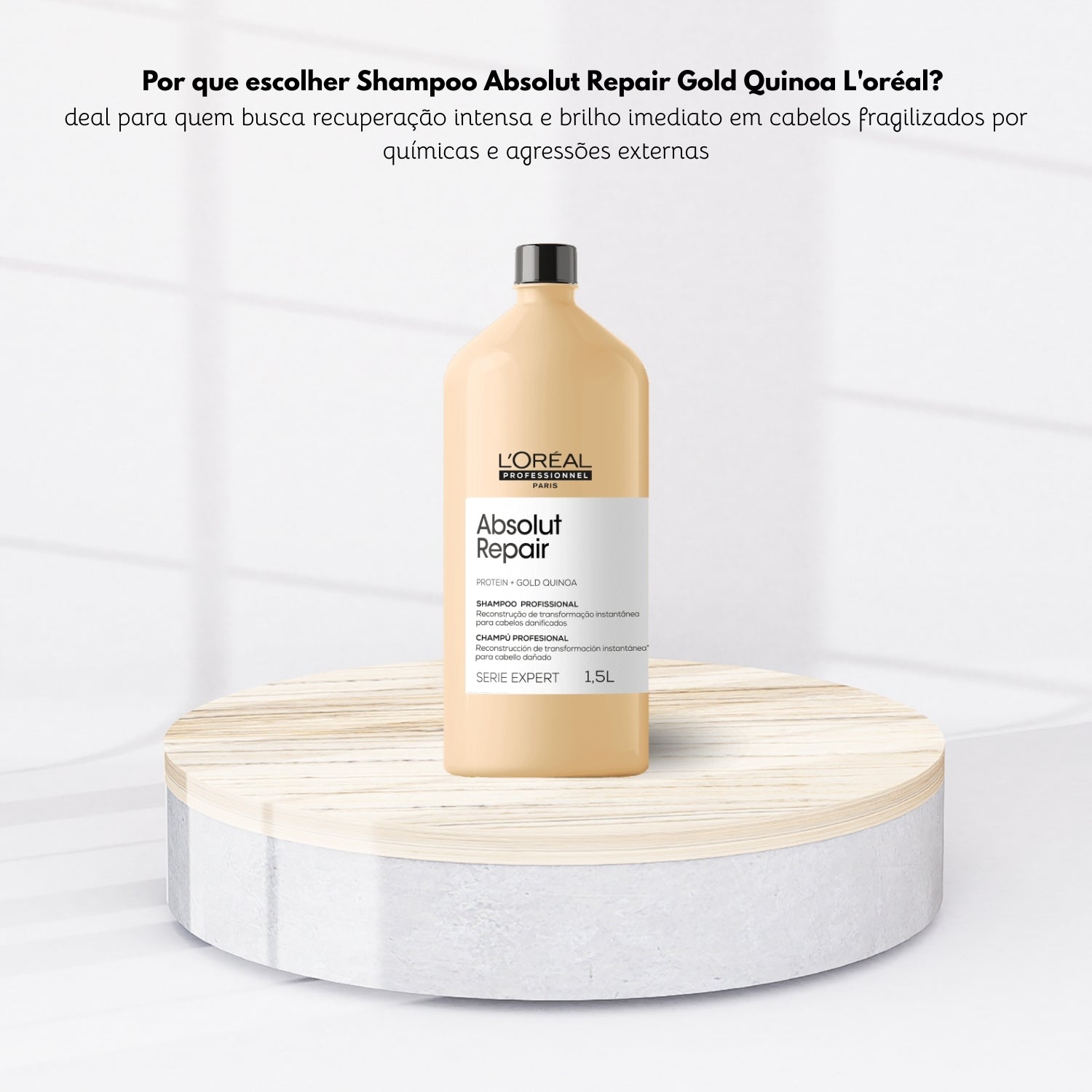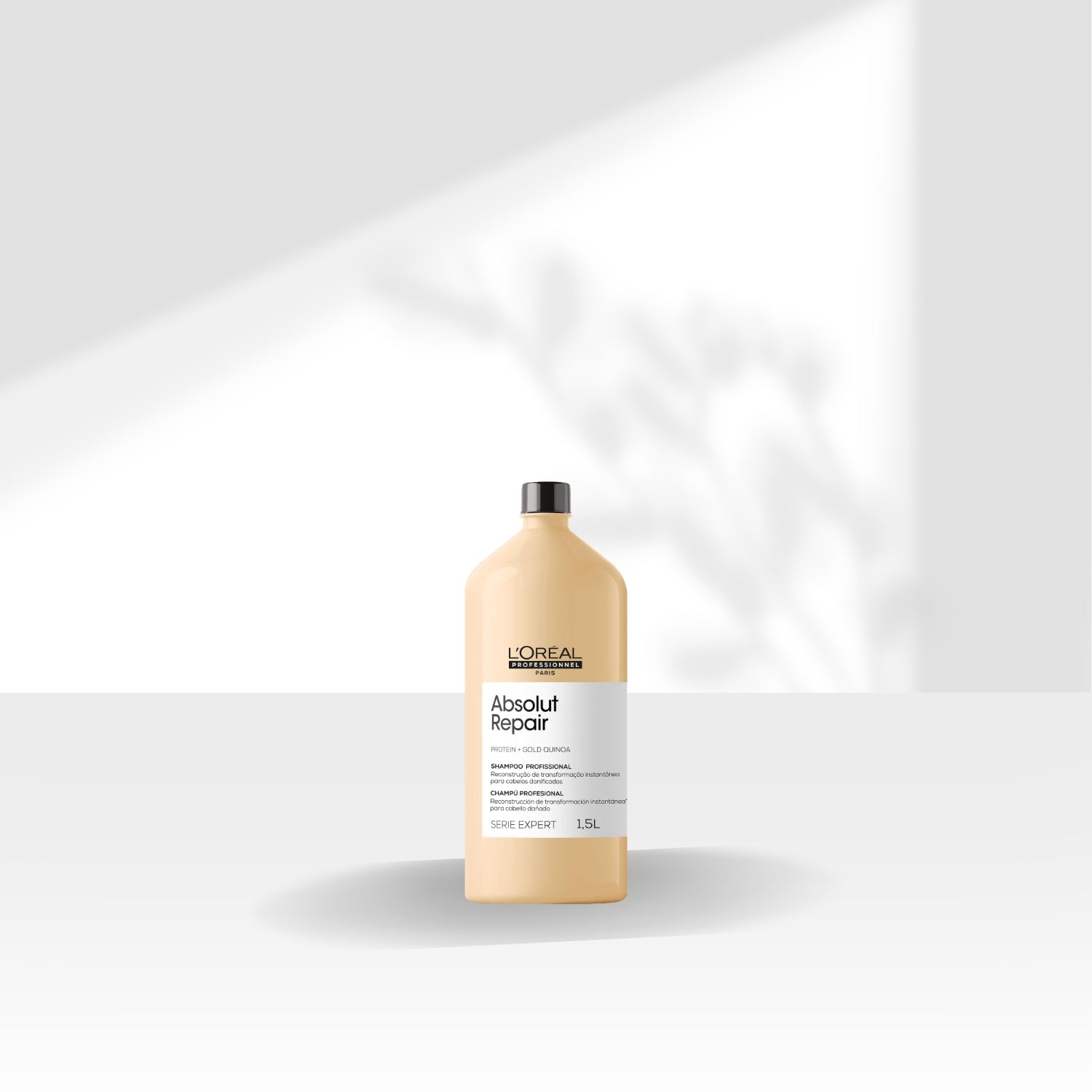 O Shampoo Loreal Absolut Repair Gold Quinoa 1,5L foi desenvolvido para oferecer tratamento profissional com performance avançada, promovendo melhoria visível na qualidade da fibra capilar conforme a proposta da linha L’Oréal Professionnel.